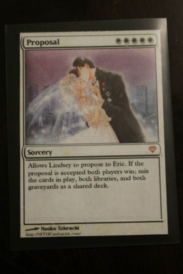 Magic is a little bit tricky to get started in. The sheer number of rules, cards, and card combinations can be a bit overwhelming. I admit that I actually despised the game for awhile, that is until I hatched a plan to use a Magic card to propose to Eric. Once the idea occurred to me I did some digging and found that someone had actually done this already. Using this online tool, and modelling the card after the example I found online, I was able to create my own proposal card. I used the image file to order it as a custom sticker at Kinkos, and with their friendly assistance I was able to make it look fairly nice. I put the sticker on a basic land card and slipped it into a sleeve to help mask the extra sticker layer.