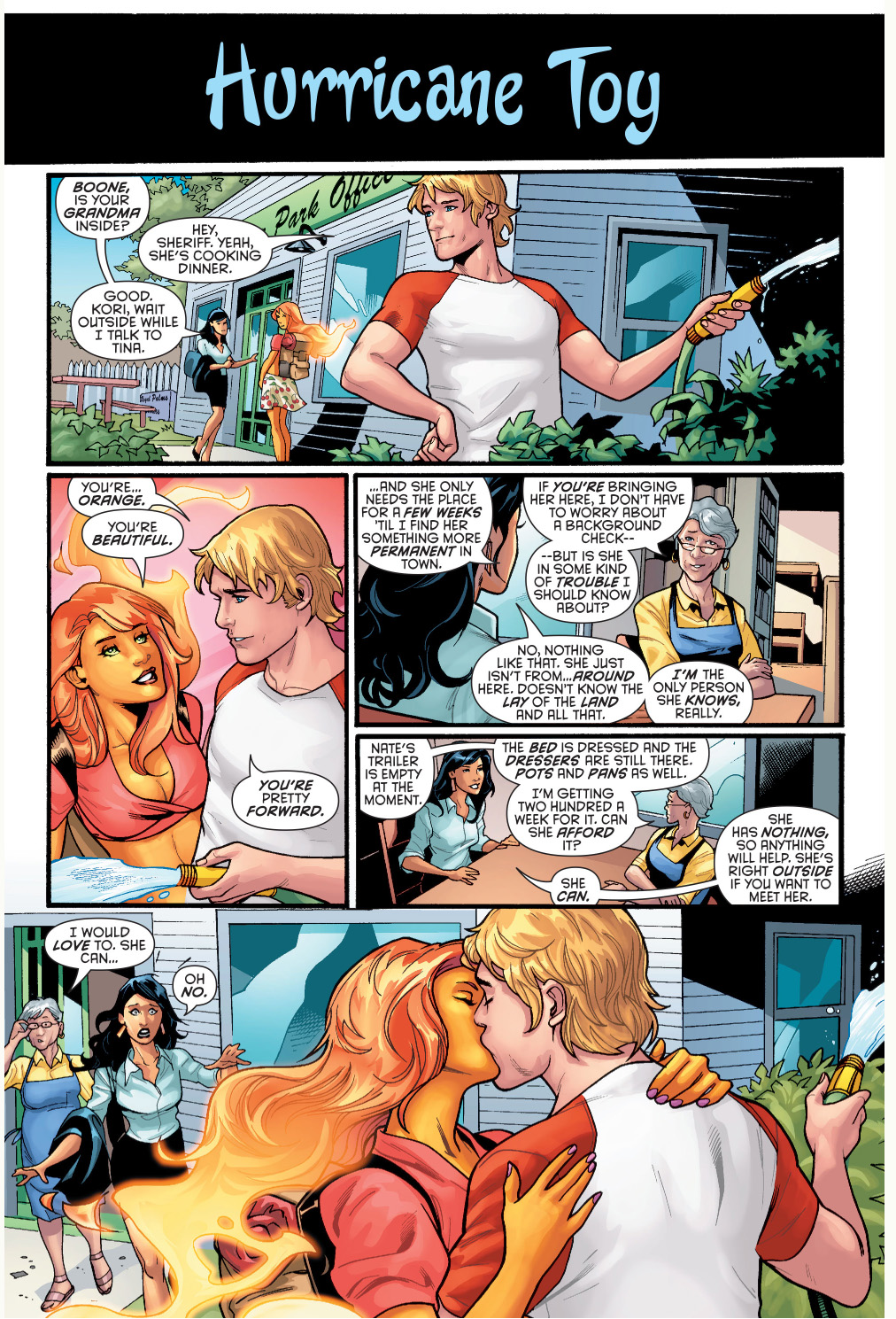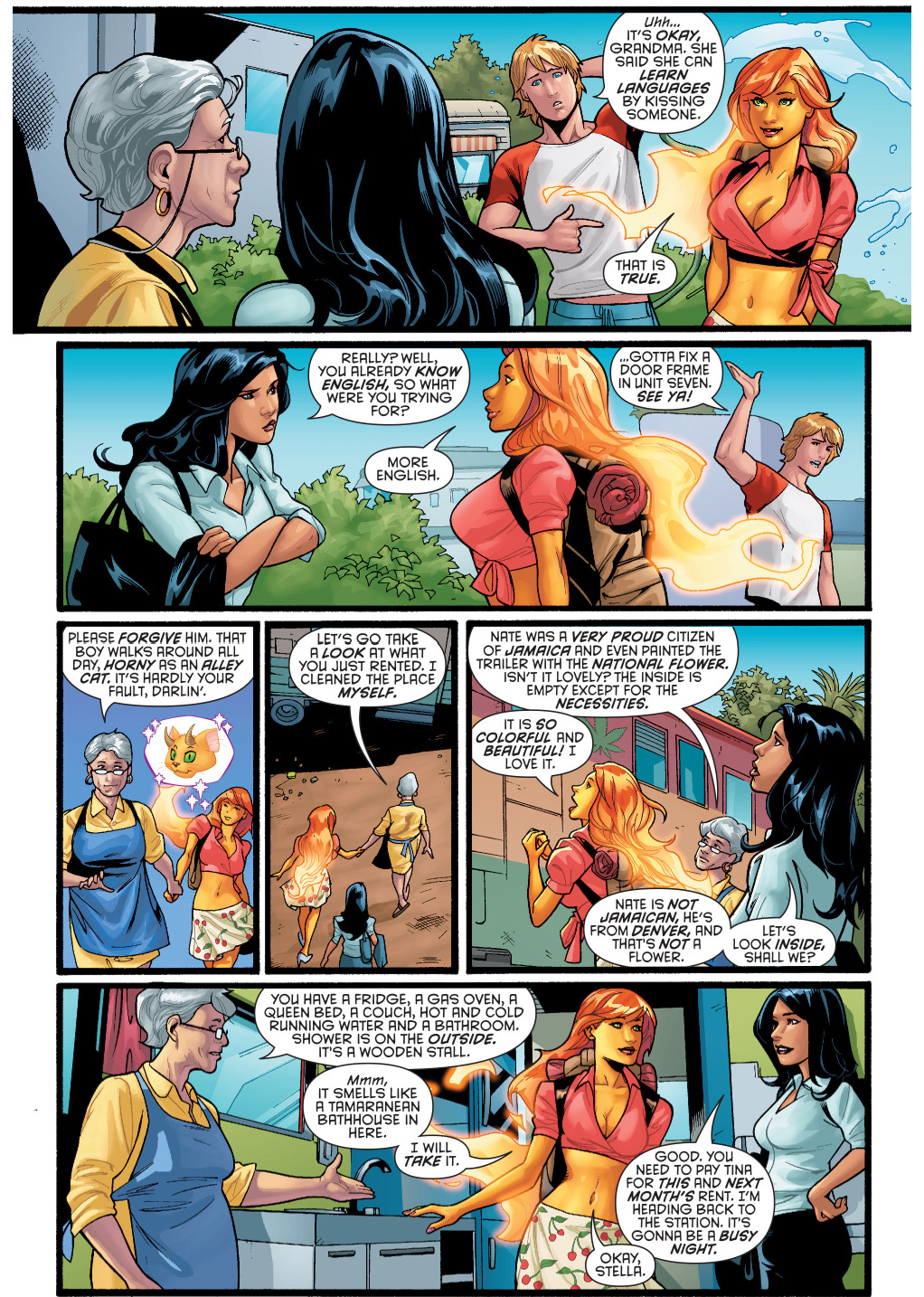 While it is not clear if Starfire kissed the young man with his permission or not, she came on to him in a way that would be offensive if the gender of the individuals were reversed. Even if she didn’t ask for his permission, society would tell this man that he is lucky to have such a beautiful woman kissing him. The entire underlying assumption is that he is a straight man with a high sex drive. The older woman confirms this societal expectation immediately after the encounter, and adds another dose of benevolent sexism by seeing Starfire as innocent in the exchange. Either way, it is troubling that the old woman does not seem like she’s going to do anything about the potential sexual assault.
