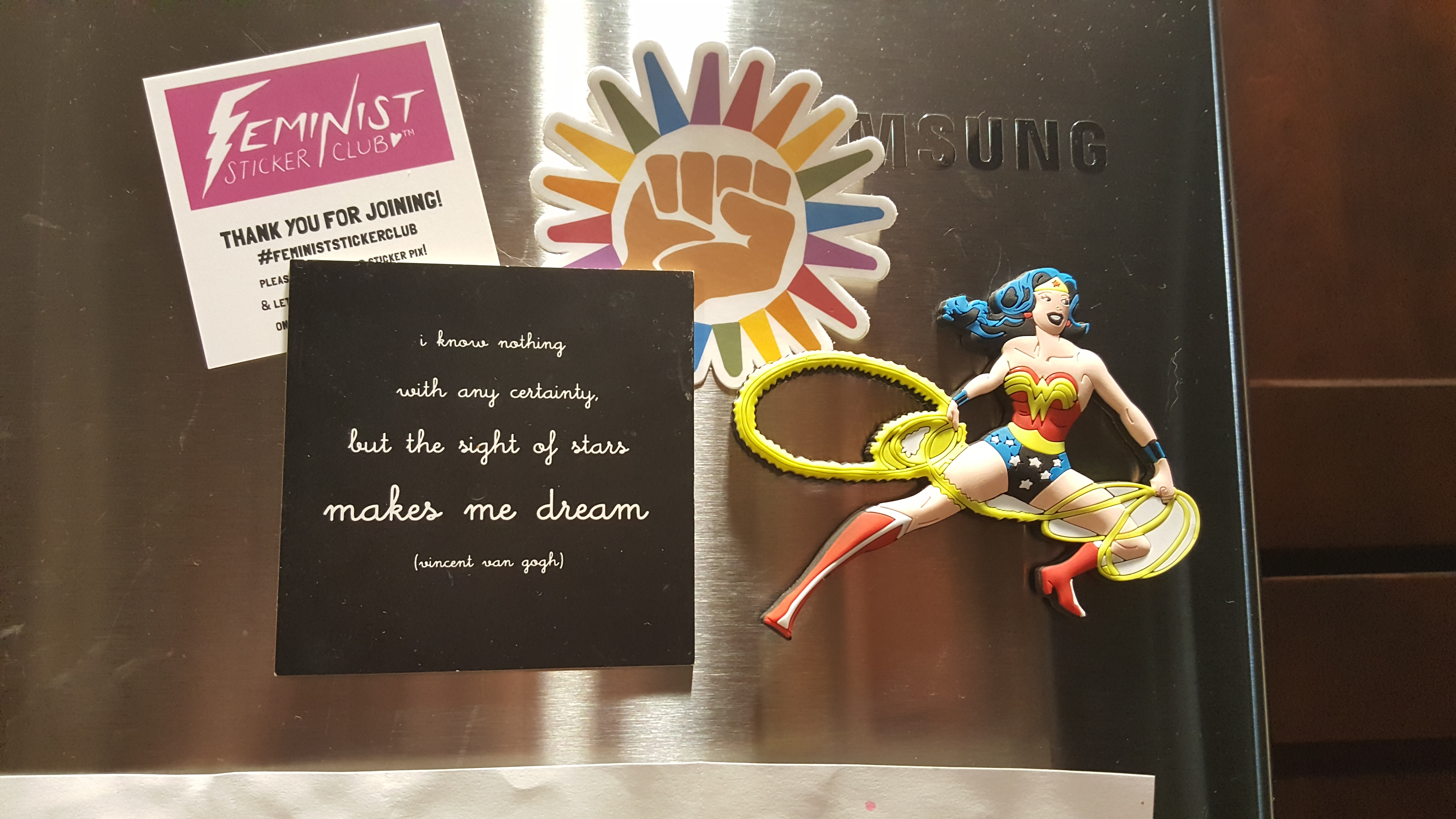 After reading about the Feminist Sticker Club in Bitch Magazine, I knew I needed this extra dose of feminism in my life. I received my first month’s sticker recently, and here it is up on my fridge, next to Wonder Woman and one of my favorite quote magnets. It is several inches in diameter, and the colors really pop.