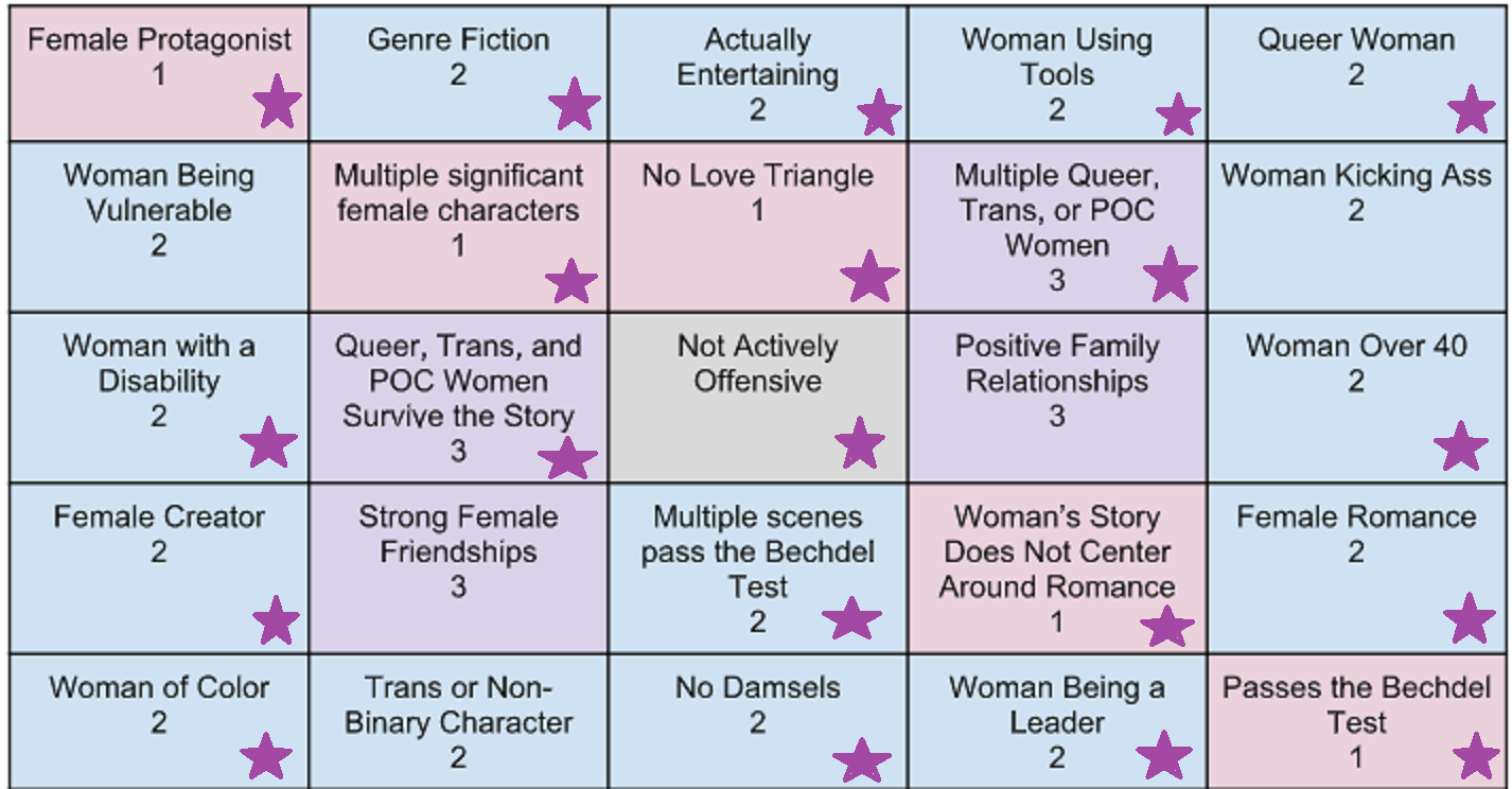 F-BOM is working on an alternative to the HerStoryArc Scale of Inclusivity, so below, we present to you Feminist Bingo, with Ithaka Rising as the contestant. Let us know what you think!